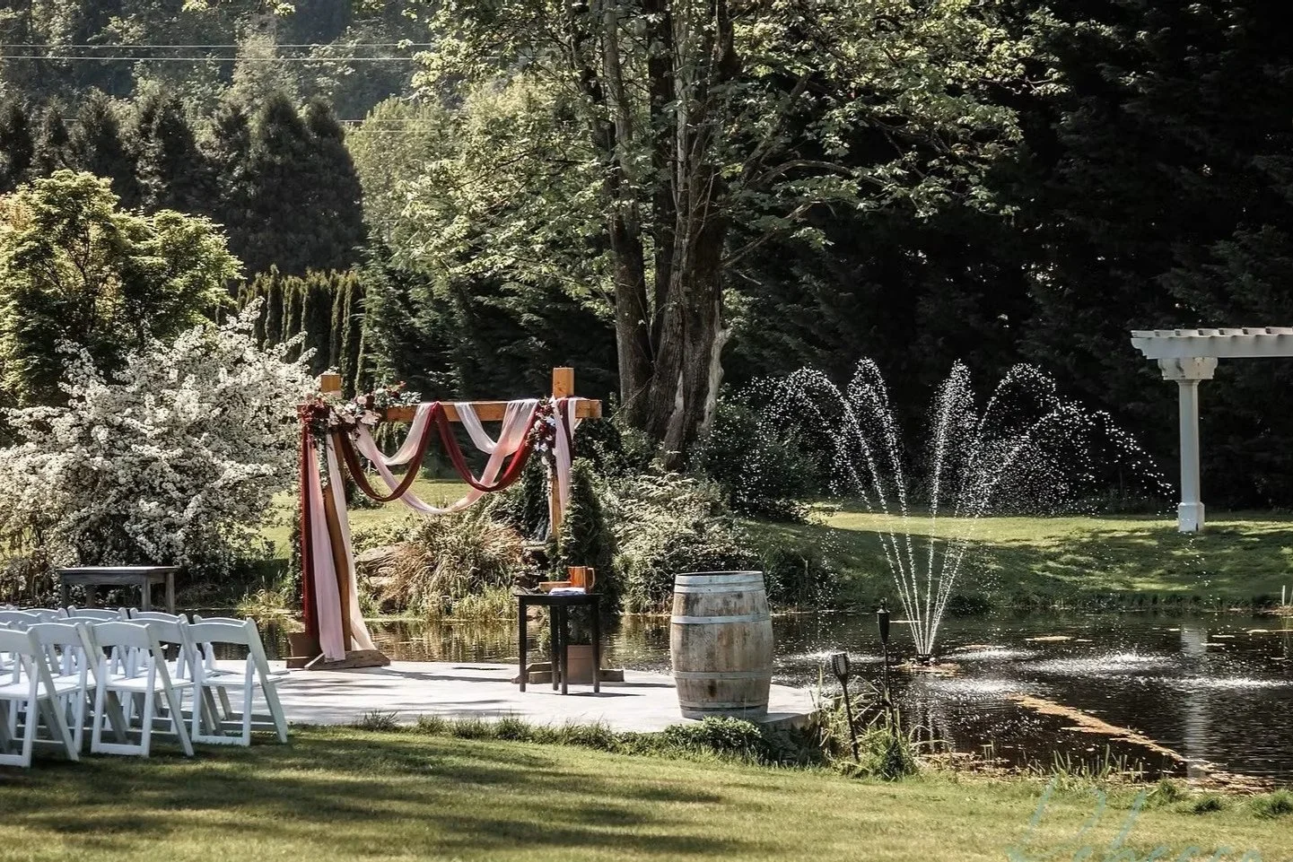 Picture your dream ceremony at Indian Summer Golf & Country Club, a premier Thurston County wedding venue. Set in a beautifully landscaped courtyard beneath towering oak trees, guests can admire the magnificent wetlands. As one of the most scenic wedding locations in Olympia, our natural surroundings create a breathtaking backdrop for stunning wedding photos you’ll cherish for years to come. Every corner of our property offers picturesque photo opportunities, from our intricately landscaped gardens to the charming entrance pond, making for a truly unforgettable setting.